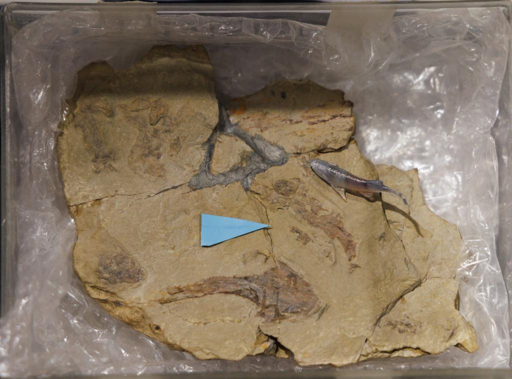 3日、中国科学院古脊椎動物・古人類研究所で開かれた記者発表会で展示された重慶始骨魚(Eosteus chongqingensis)の化石。(北京=新華社記者/金立旺)