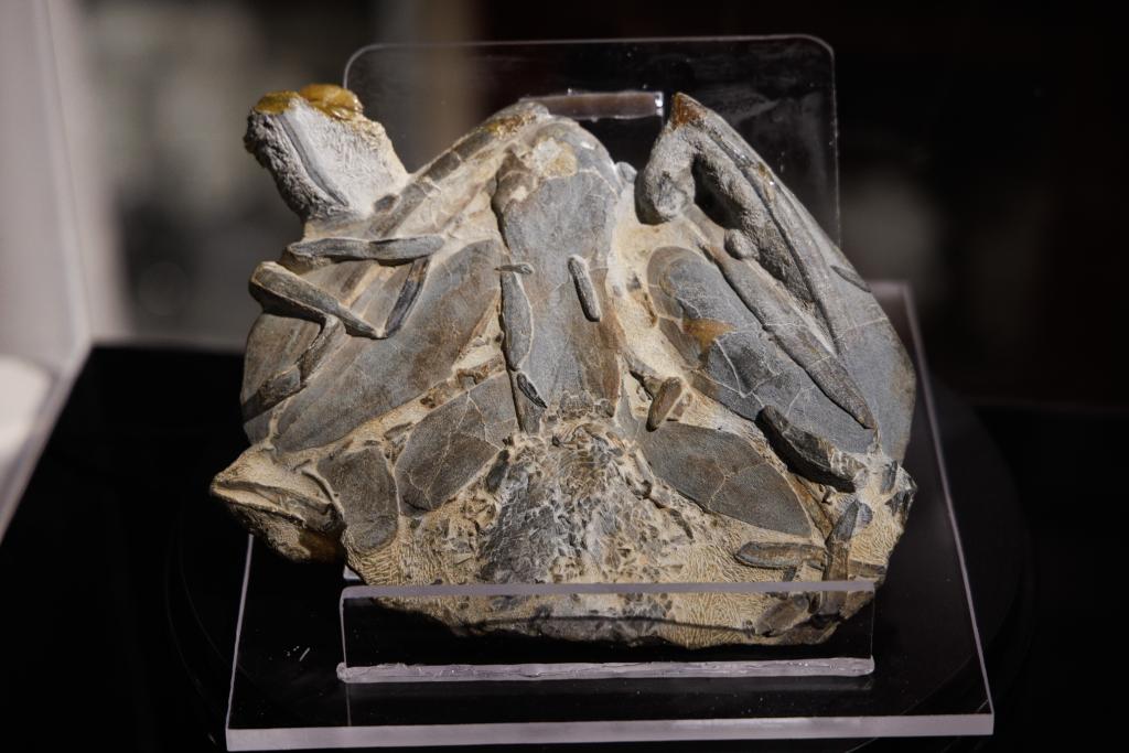 3日、中国科学院古脊椎動物・古人類研究所で開かれた記者発表会で展示された鈍歯宏顎魚(Megamastax amblyodus)の化石。(北京=新華社記者/金立旺)