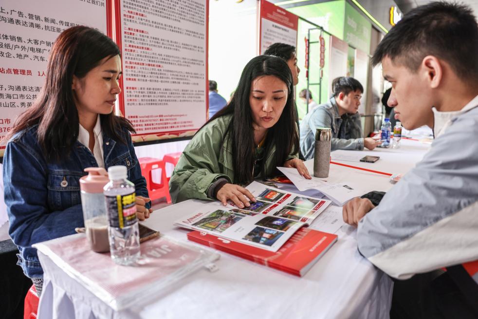 13日、就職フェアで、就業支援政策の説明を聞く求職者。(海口=新華社記者/張麗蕓)