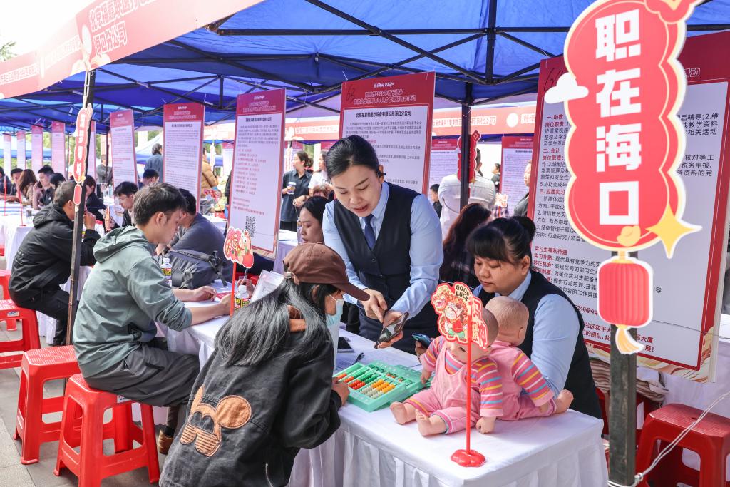 13日、就職フェアで、就業支援政策の解説に耳を傾ける求職者たち。(海口=新華社記者/張麗蕓)
