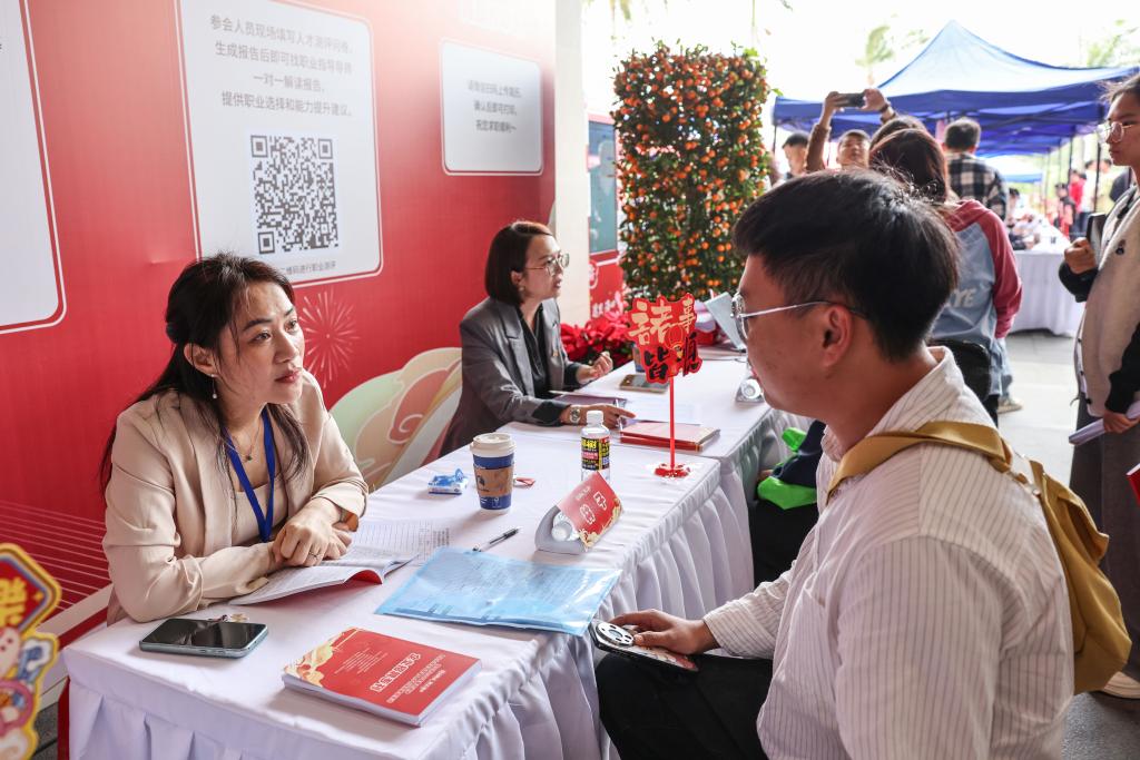 13日、就職フェアで、企業の採用担当者と面談する求職者。(海口=新華社記者/張麗蕓)