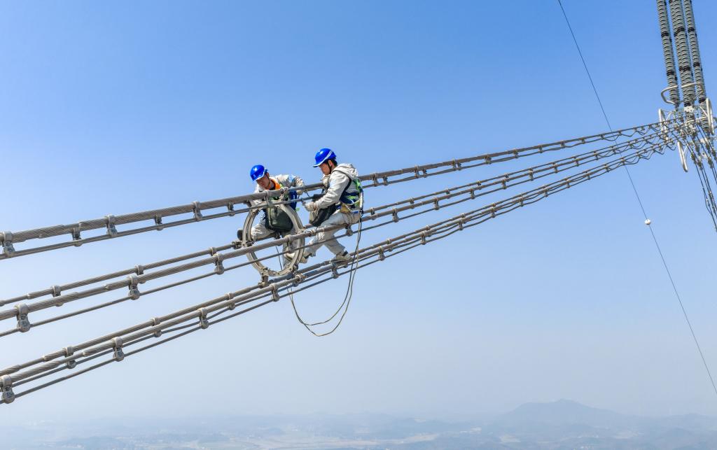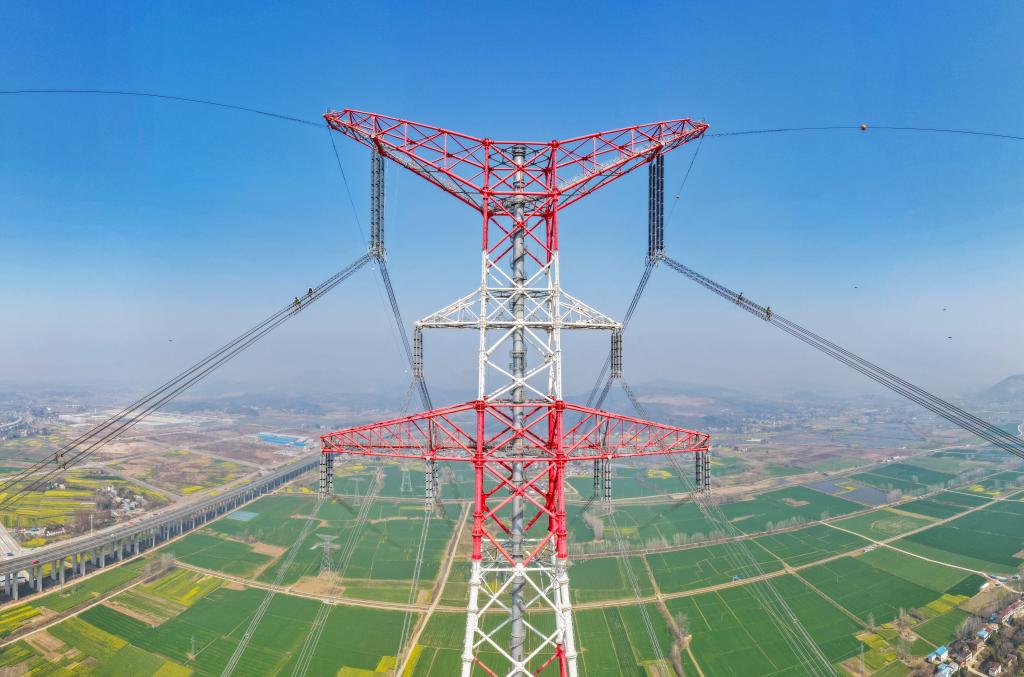 【新華社合肥3月13日】中国西部の電力を東部に送る「西電東送」プロジェクトの重要ルートで安徽省銅陵市樅陽(しょうよう)県の長江沿いに位置するプラスマイナス800キロボルト超高圧金塘線でこのほど、全面的な点検が始まった。専用の防護具を着けた作業員が最高345メートルの超高圧送電線に登り、設備の安全性を確認した。