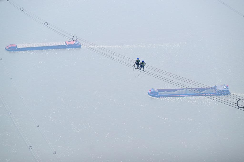 10日、安徽省銅陵市樅陽県の長江沿いで、高さ300メートル以上の場所に登って点検を行う安徽送変電工程の作業員。(ドローンから、樅陽=新華社配信/鄭賢列)