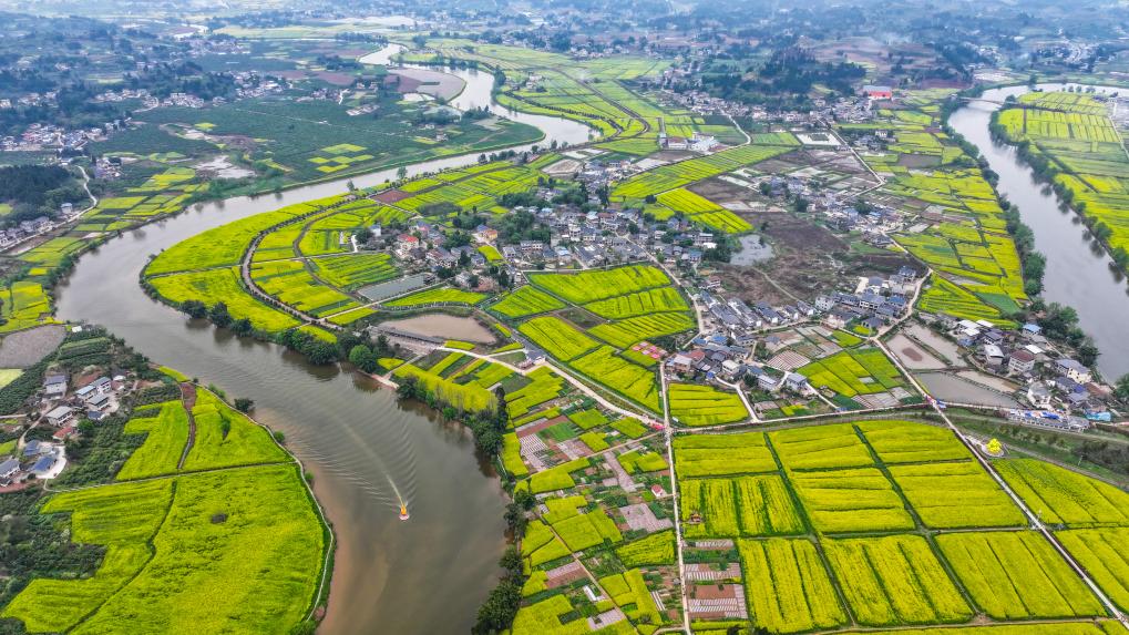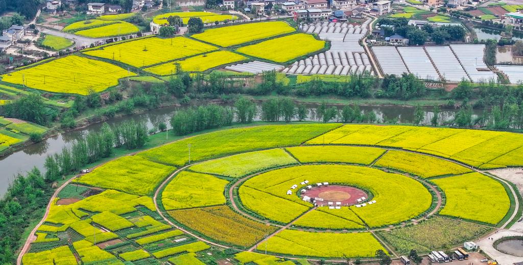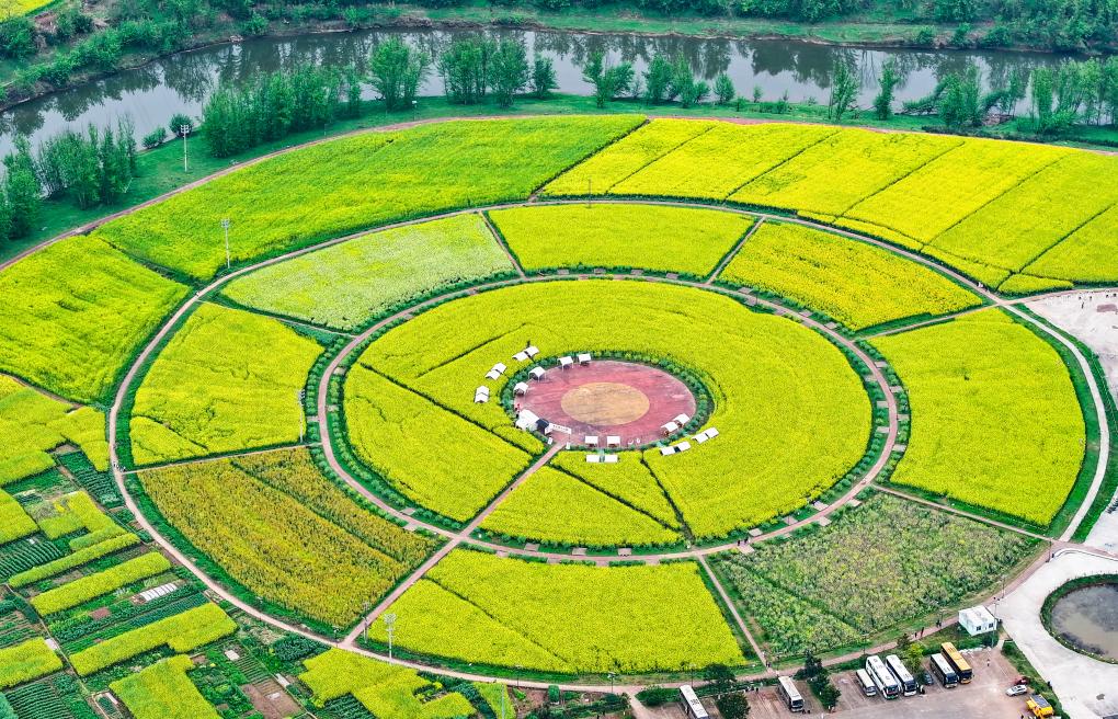 12日、重慶市の潼南崇龕花海風景区。(ドローンから、重慶=新華社記者/王全超)