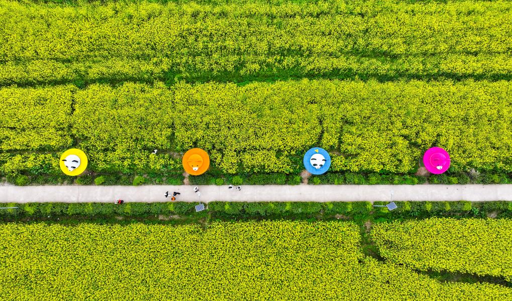 12日、重慶市の潼南崇龕花海風景区を散策する観光客。(ドローンから、重慶=新華社記者/王全超)