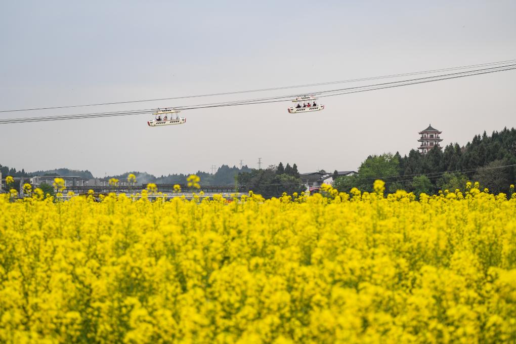 12日、重慶市の潼南崇龕花海風景区で運行されている観光ゴンドラ。(重慶=新華社記者/王全超)