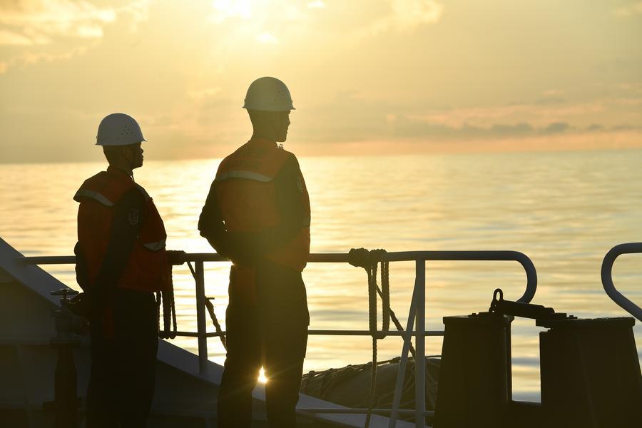 8日、捜索救助訓練を実施する三都艦編隊の法執行要員。(南中国海=新華社記者/毛俊)