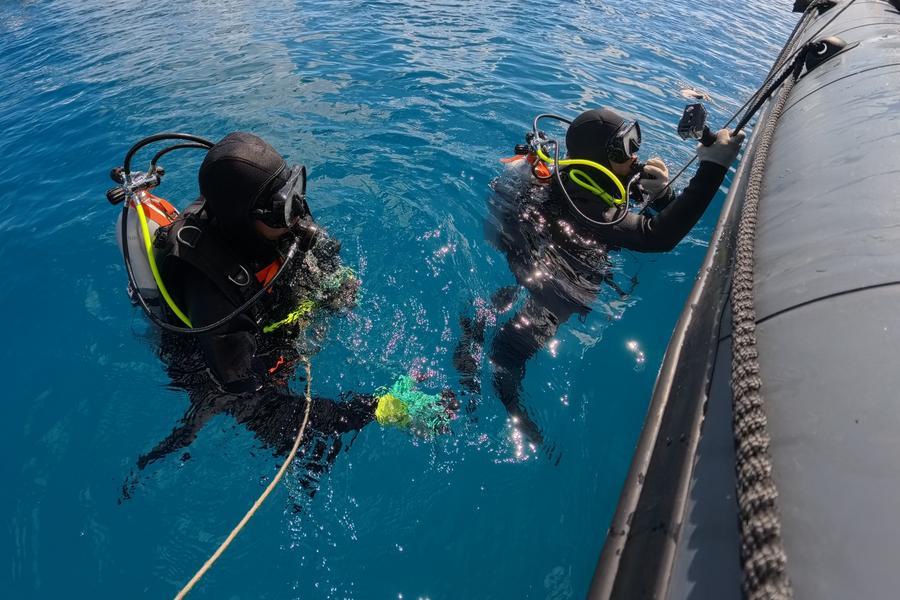 1日、南中国海で潜水訓練を行う三都艦編隊の法執行要員。(南中国海=新華社記者/毛俊)