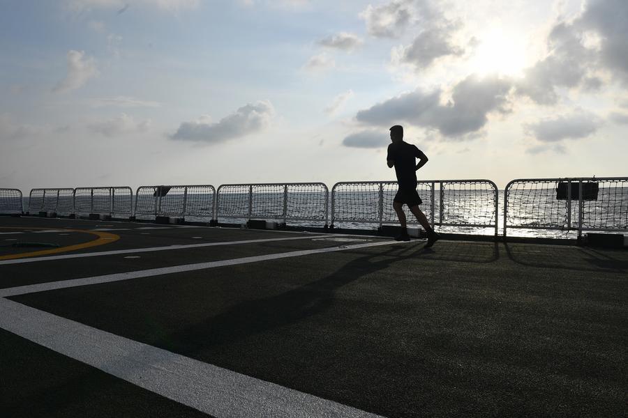 8日、甲板でランニングする三都艦編隊の法執行要員。(南中国海=新華社記者/毛俊)