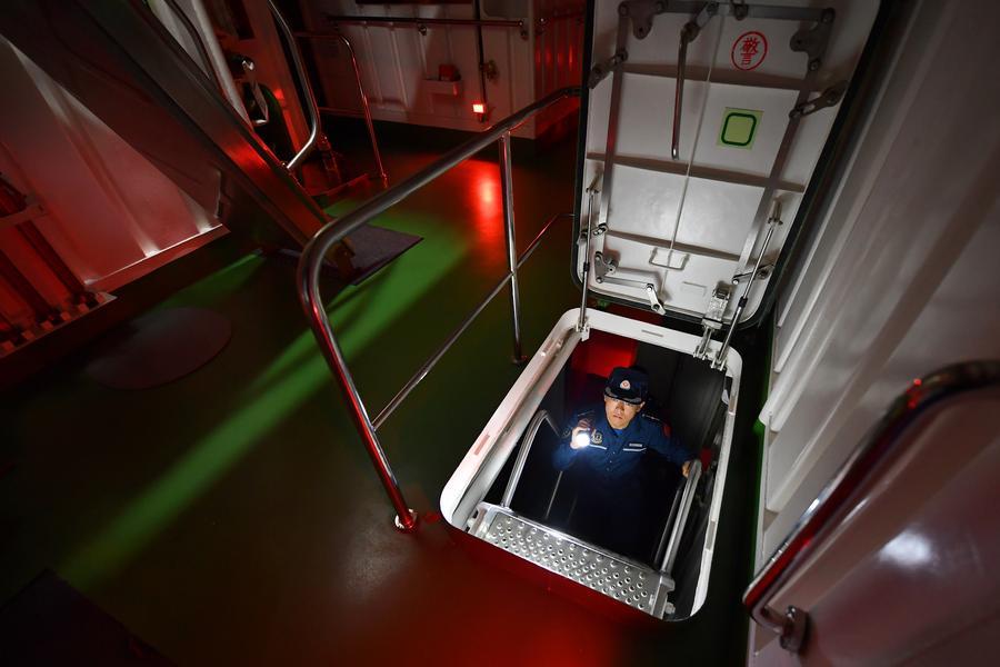 8日、艦内を点検する三都艦編隊の法執行要員。(南中国海=新華社記者/毛俊)