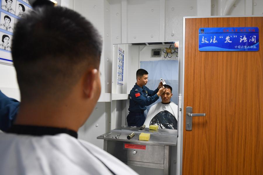 8日、散髪する三都艦編隊の法執行要員。(南中国海=新華社記者/毛俊)