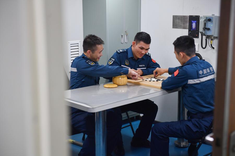 8日、休憩時間に囲碁を指す三都艦編隊の法執行要員。(南中国海=新華社記者/毛俊)