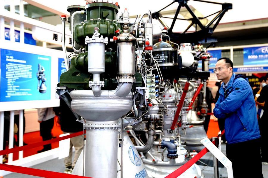 12日、会場に展示されたロケットエンジンを見学する来場者。(上海=新華社記者/張建松)