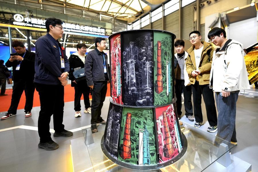 12日、会場に展示された衛星構体を見学する来場者。(上海=新華社記者/張建松)