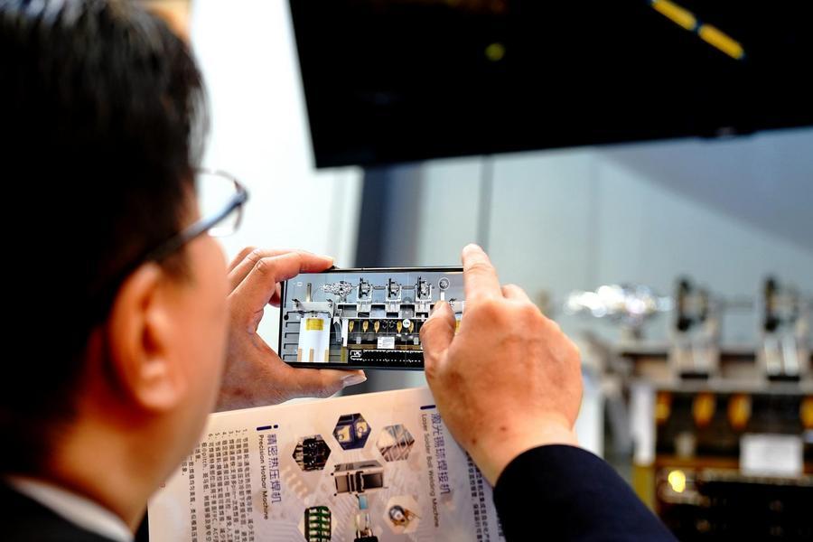 12日、会場に展示された巻き取り式フレキシブル太陽電池パドルを撮影する来場者。(上海=新華社記者/張建松)