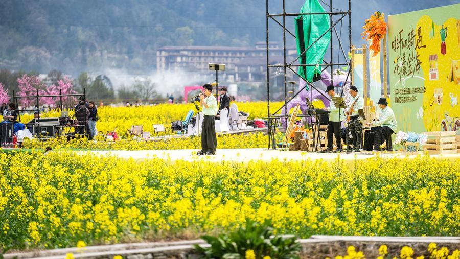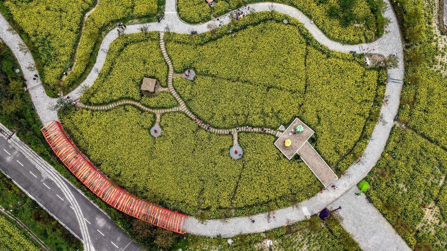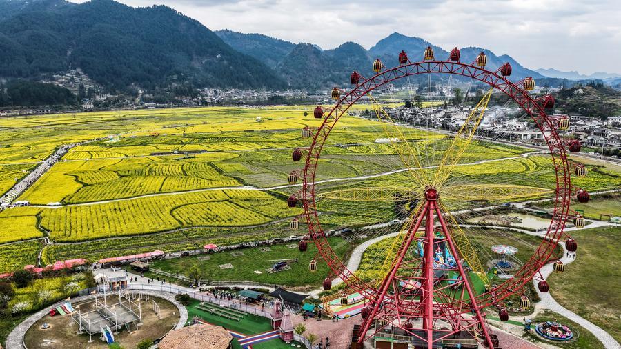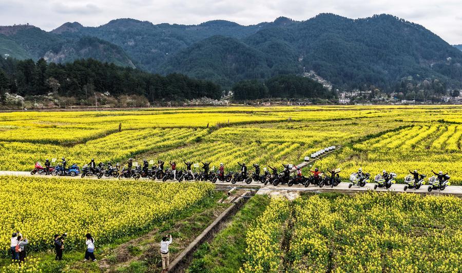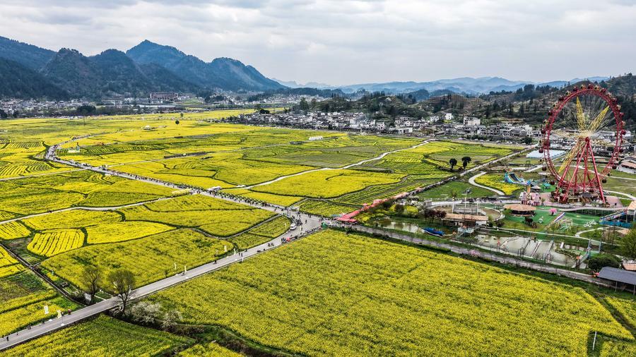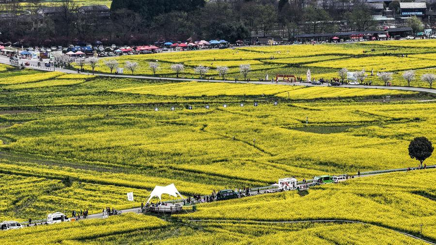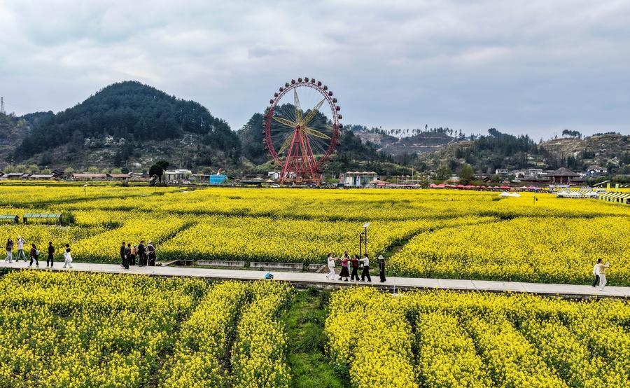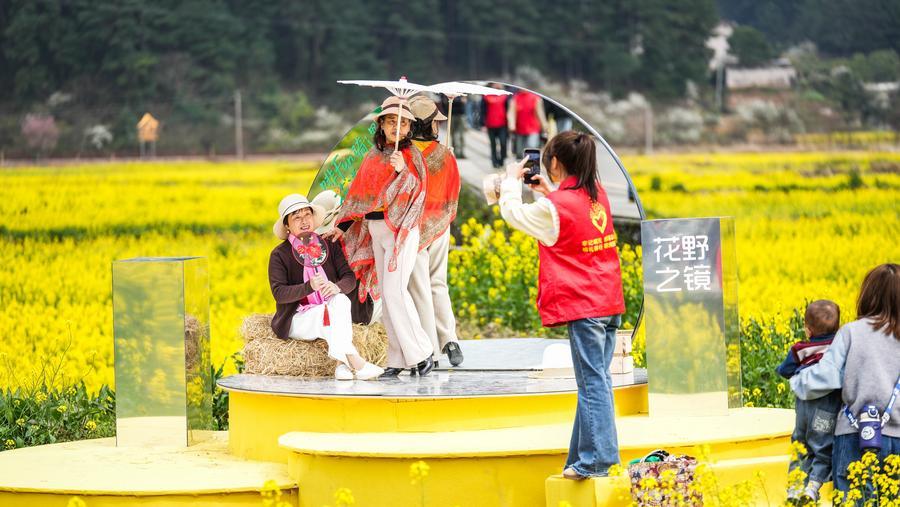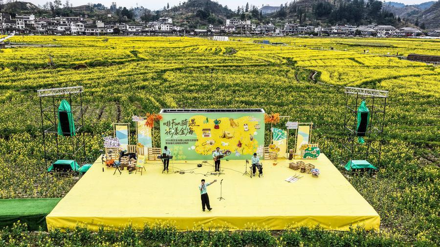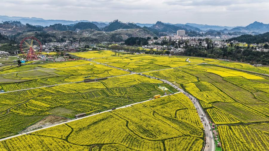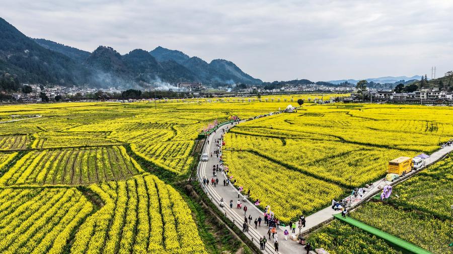 【新華社貴定3月14日】中国貴州省黔南(けんなん)プイ族ミャオ族自治州貴定県の「金海雪山」風景区で菜の花が見頃を迎え、多くの観光客を引き付けている。