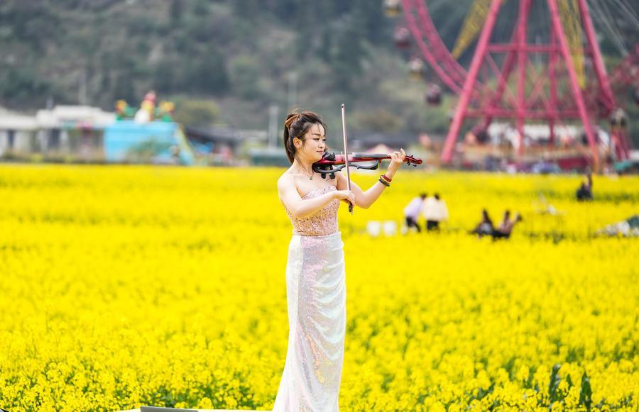 13日、貴定県の「金海雪山」風景区でバイオリンを演奏する奏者。(貴定=新華社記者/陶亮)