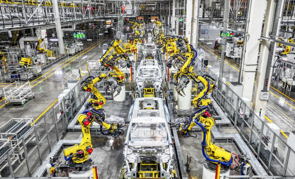 重慶市両江新区にある新エネルギー車メーカー、賽力斯(セレス)汽車のスーパーファクトリーの自動化された生産ライン。(2025年9月19日撮影、重慶=新華社記者/王全超)