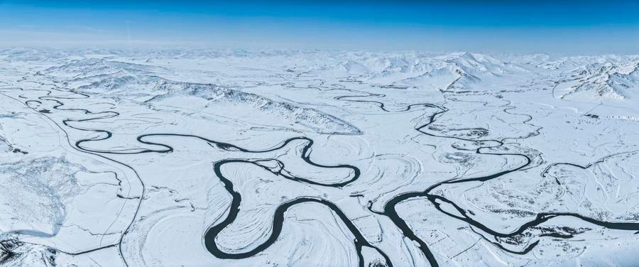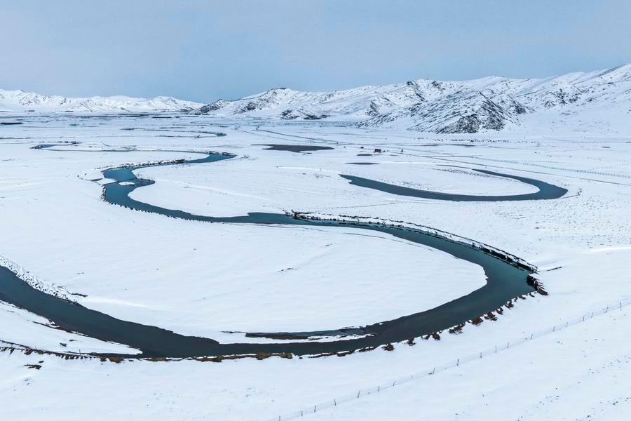 14日、一面の雪景色となったアバ県の草原。(ドローンから、アバ=新華社配信/米林)