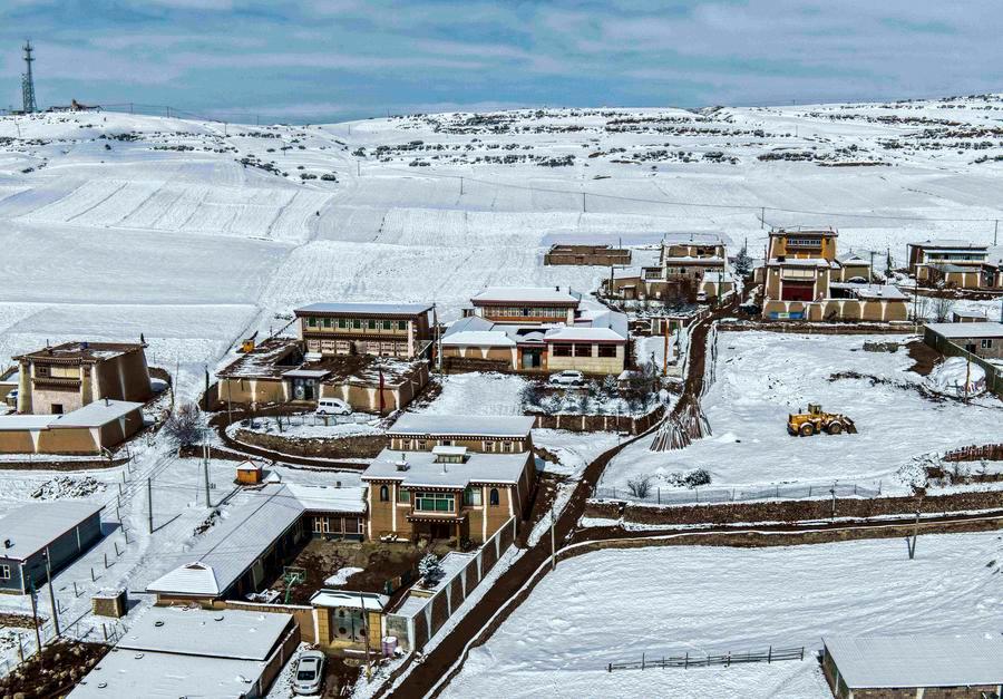 14日、アバ県の安多(アムド)民居の雪景色。(ドローンから、アバ=新華社配信/米林)