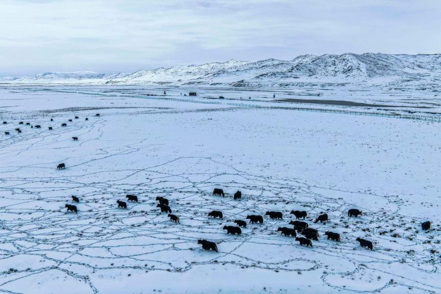 14日、一面の雪景色となったアバ県の牧場。(ドローンから、アバ=新華社配信/米林)