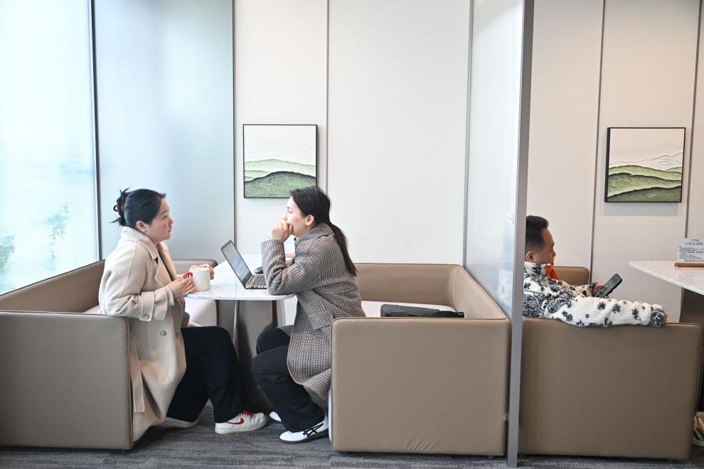 12日、南京市河西中央科創区のアリババセンター内にある親橙OPC社区で、隣のワークスペースの起業家と交流する昱脈科技の創業者、王鵬さん(右)。(南京=新華社記者/季春鵬)