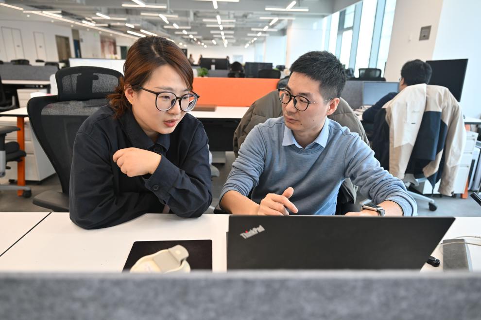 12日、南京市河西中央科創区のアリババセンター内にある親橙OPC社区で、企業サービスチームの職員とニーズについて打ち合わせる昱脈科技の創業者、王鵬さん(右)。(南京=新華社記者/季春鵬)