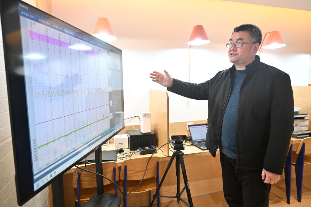 11日、中国(南京)ソフトウエアバレーの「質能・工坊」OPC社区で、マルチモーダル心理総合評価システムを紹介する江蘇小微数字科技の創業者、左賦斌さん。(南京=新華社記者/季春鵬)