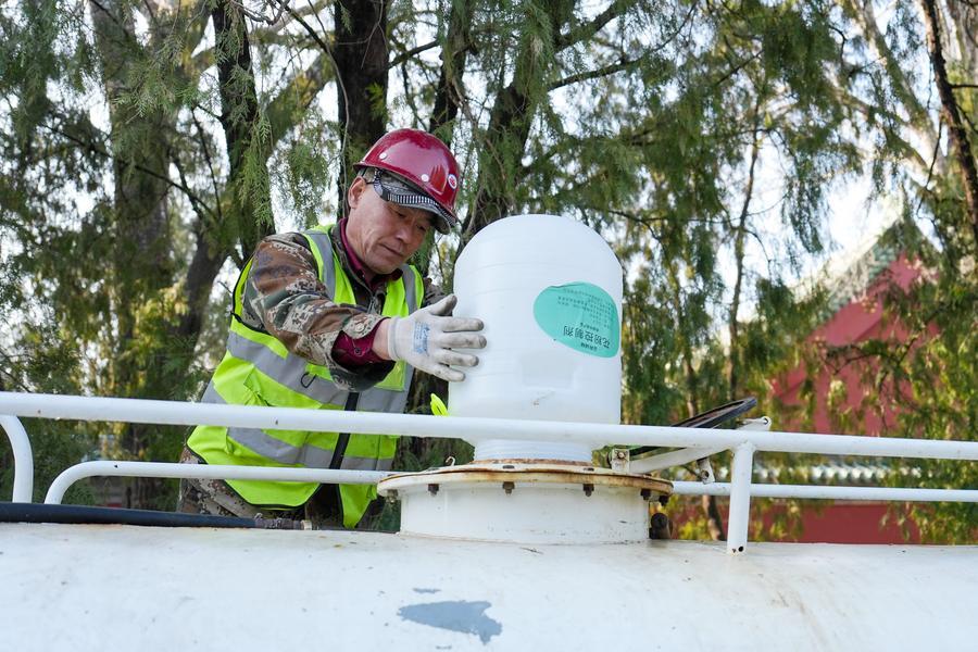 15日、北京市の地壇公園で、散水車に花粉制御剤を入れる職員。(北京=新華社記者/鞠煥宗)