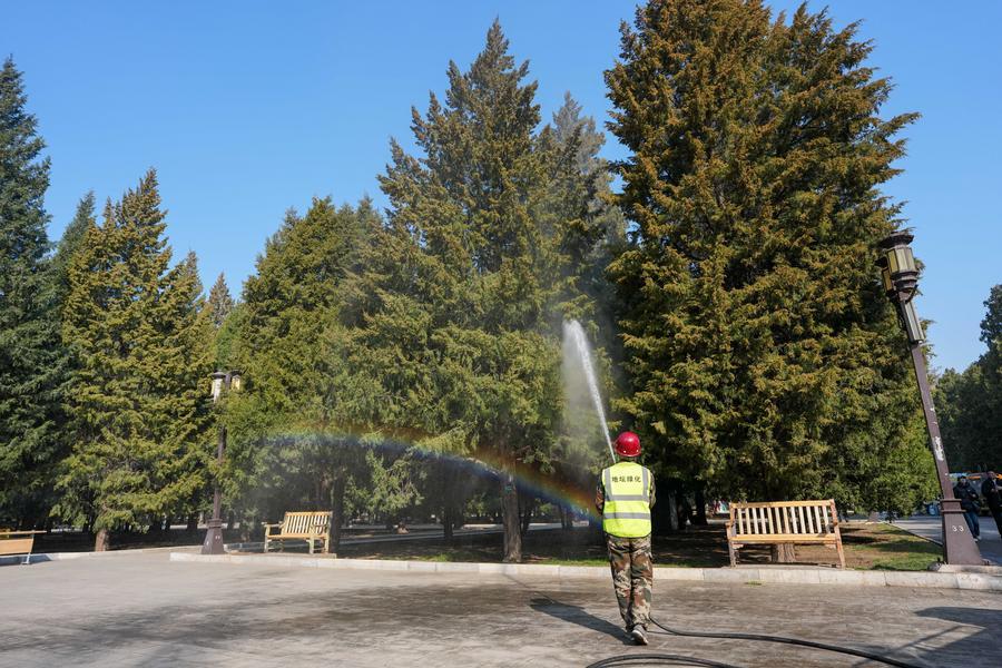 15日、北京市の地壇公園で、花粉固定剤を加えた水をコノテガシワに散布する職員。(北京=新華社記者/鞠煥宗)