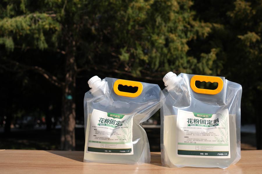 15日、北京農学院植物科学技術学院の秦嶺(しん・れい)教授のチームが開発した花粉固定剤。(北京=新華社記者/鞠煥宗)