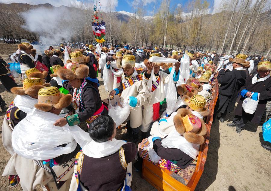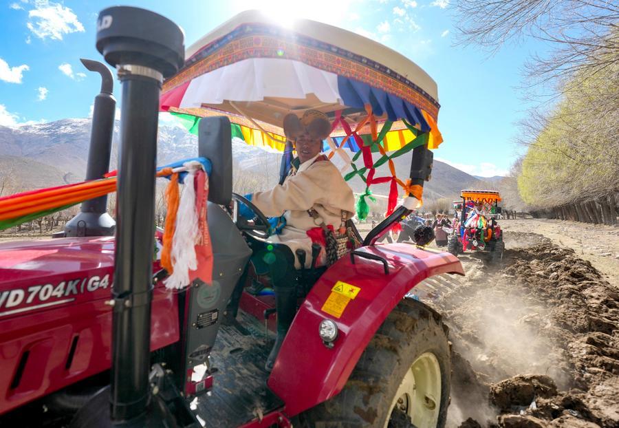 【新華社山南3月17日】中国西蔵自治区の各地で16日、春の耕作開始を祝う祭典が開かれた。山南市の結巴村では住民200人余りが華やかな民族衣装を身にまとい、千年にわたり受け継がれてきた民俗習慣にのっとって儀式を執り行った。