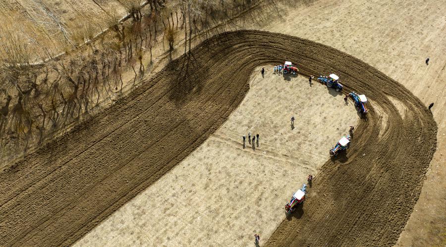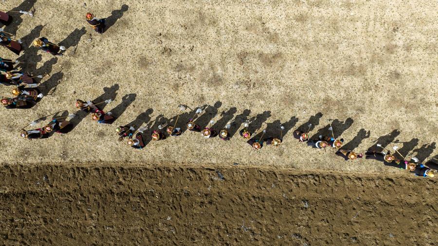 16日、山南市の結巴村で行われた耕作開始の儀式。(ドローンから、山南=新華社記者/晋美多吉)