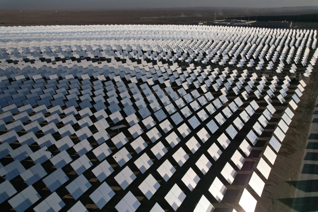 甘粛省酒泉市金塔マルチエネルギー相互補完拠点にある、10万キロワット溶融塩タワー式光熱発電プロジェクト。(2025年12月3日撮影、ドローンから、酒泉=新華社記者/范培珅)