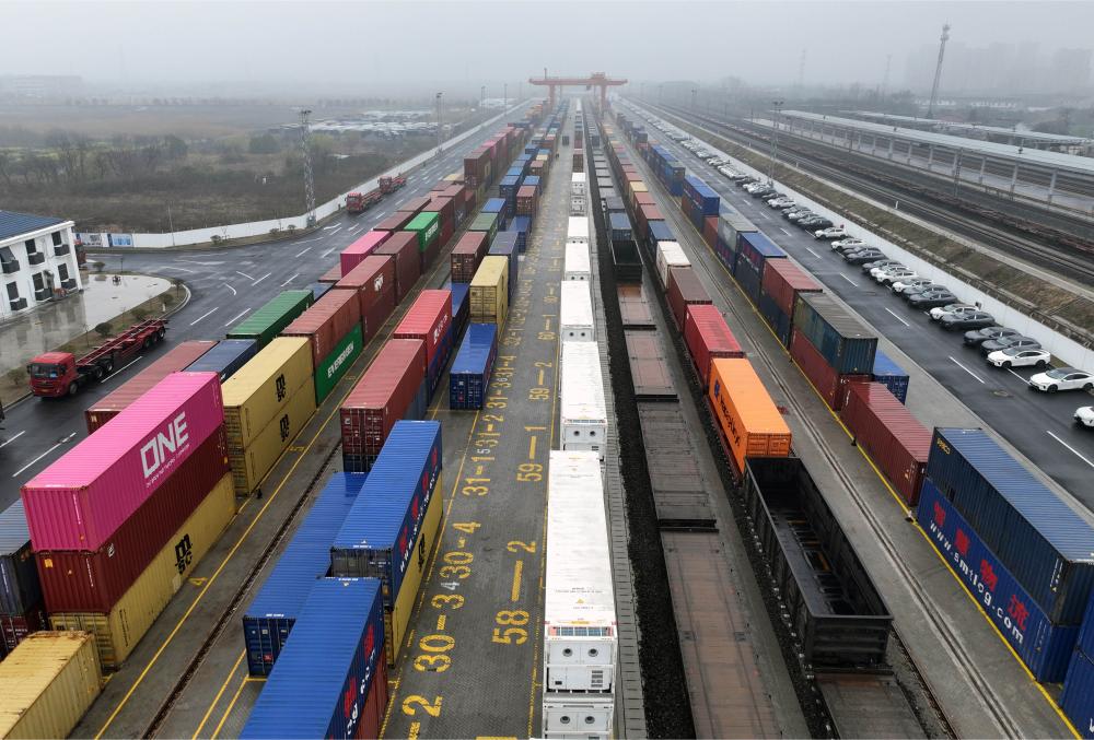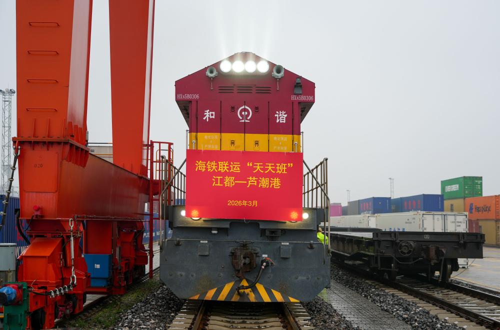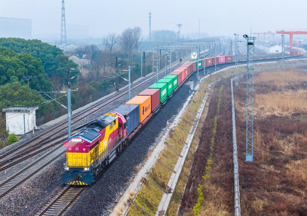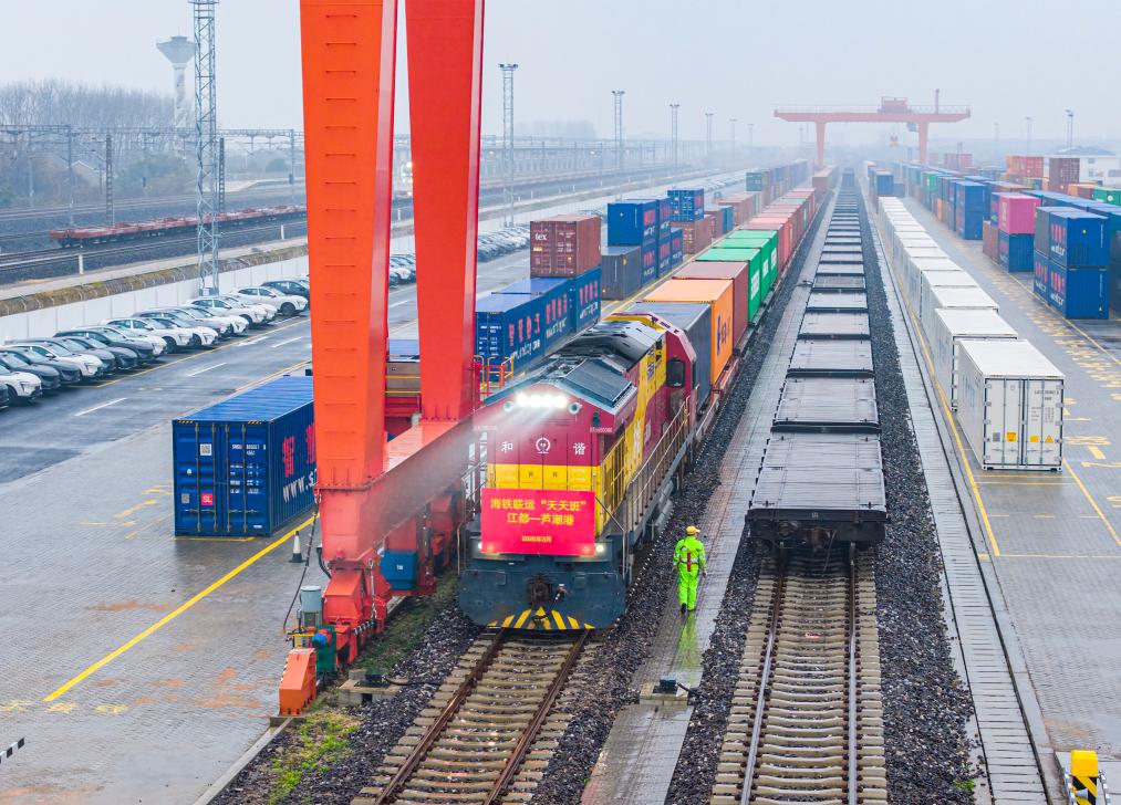 【新華社揚州3月18日】中国江蘇省揚州市江都区の南京鉄路物流センター江都物流基地で16日午後、太陽光発電モジュールや自動車部品、日用品などを積んだコンテナ列車が出発した。江都-蘆潮港間で海上・鉄道複合輸送専用列車の連日運行が正式に始まった。約12時間かけて上海の蘆潮港に到着した後、海上輸送に切り替えて欧州へ向かう。