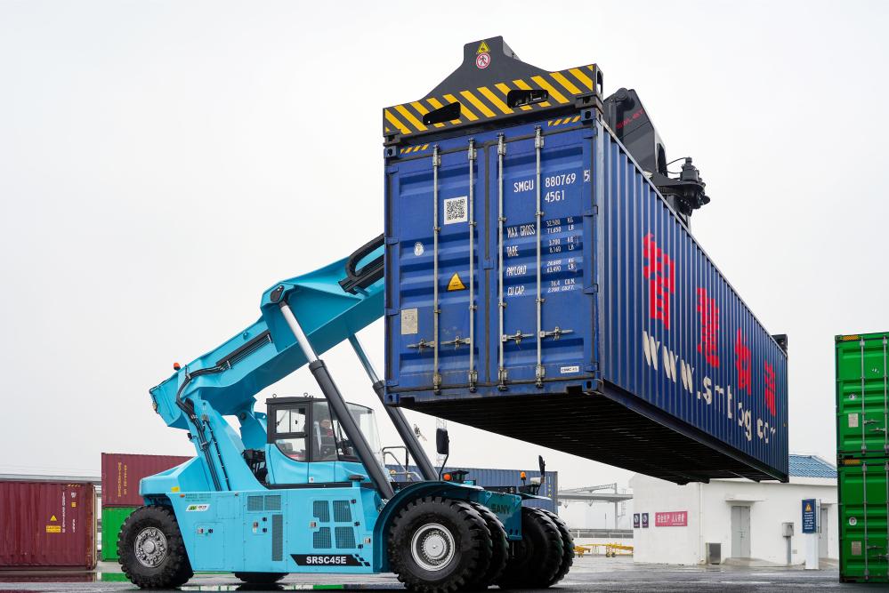 16日、南京鉄路物流センター江都物流基地で積み替えられるコンテナ。(揚州=新華社配信/湯徳宏)