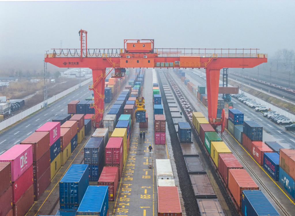 16日、江蘇省揚州市江都区の南京鉄路物流センター江都物流基地。(ドローンから、揚州=新華社配信/湯徳宏)