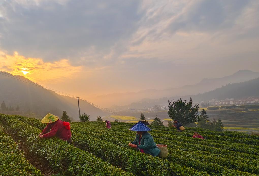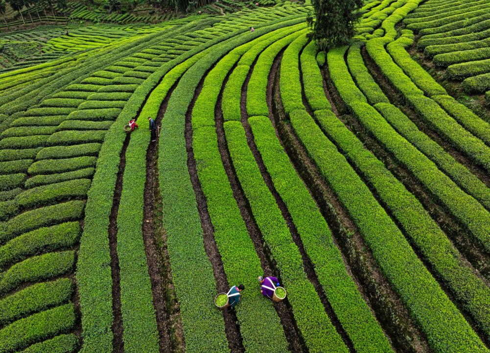 15日、四川省楽山市沐川県で茶摘みをする人たち。(楽山=新華社配信/孔勝)