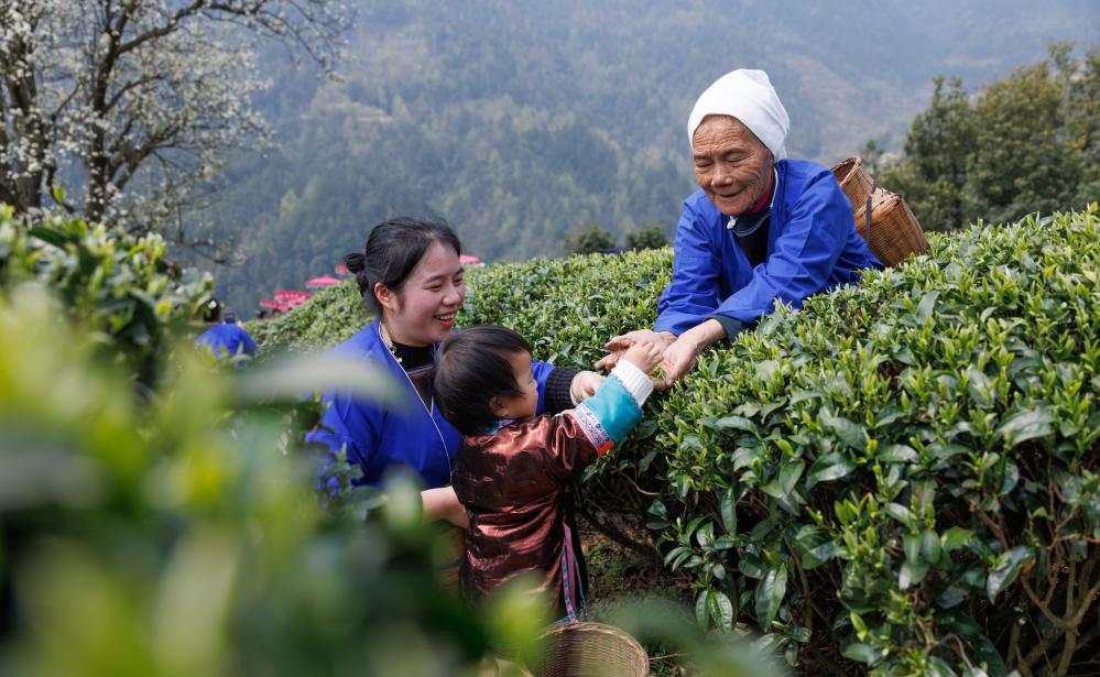 14日、広西チワン族自治区柳州市三江トン族自治県八江鎮で、3世代で茶摘みをする家族。(柳州=新華社配信/粟勇主)