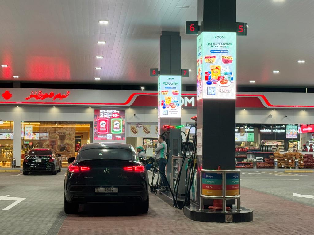 16日、アラブ首長国連邦(UAE)ドバイのガソリンスタンドで給油する車。(ドバイ=新華社記者/温新年)
