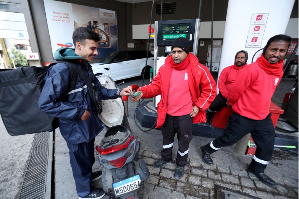 16日、レバノン・ベイルートのガソリンスタンドで支払いをする客。(ベイルート=新華社配信)