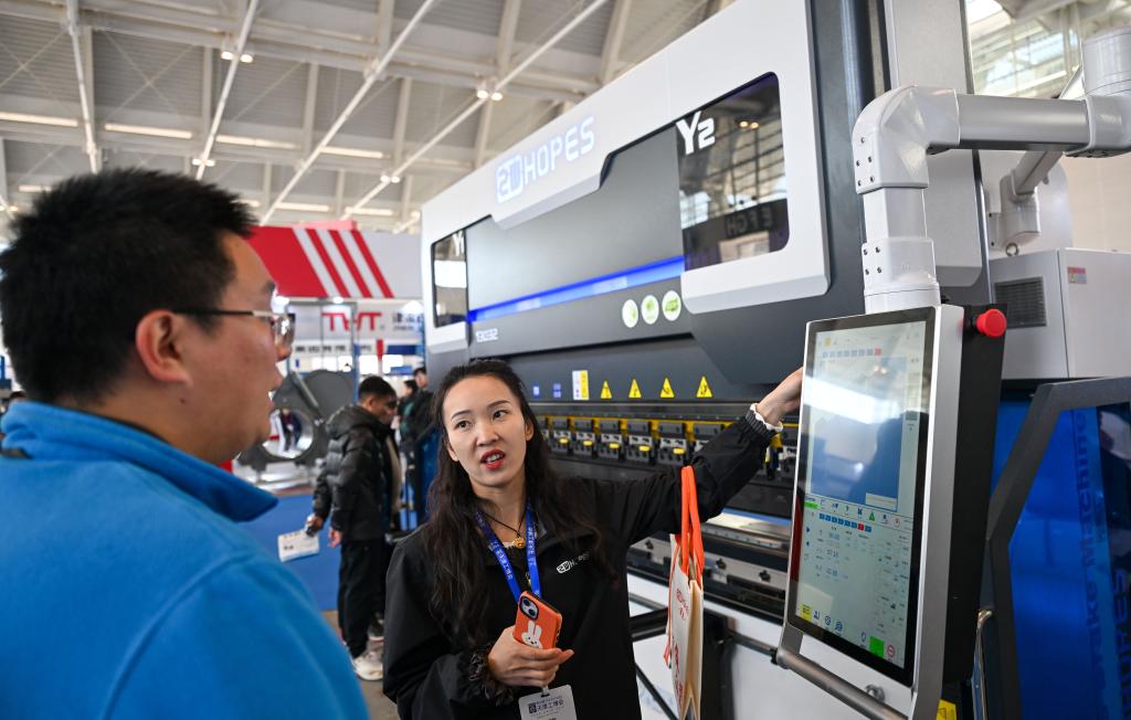 18日、国際装備製造業博覧会で、ベンディングマシンについて説明する出展者。(天津=新華社記者/孫凡越)