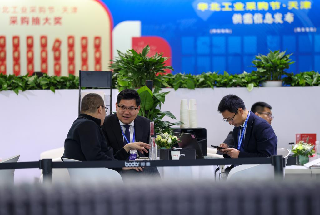 18日、国際装備製造業博覧会の会場で商談する出展者。(天津=新華社記者/孫凡越)