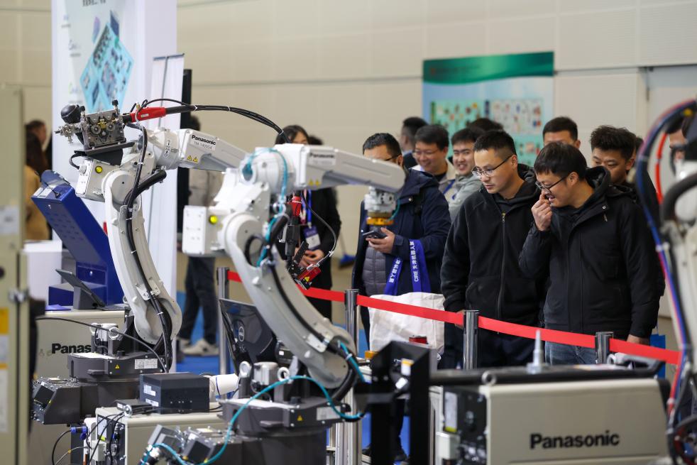18日、国際装備製造業博覧会で、産業用ロボットを見学する来場者。(天津=新華社記者/孫凡越)