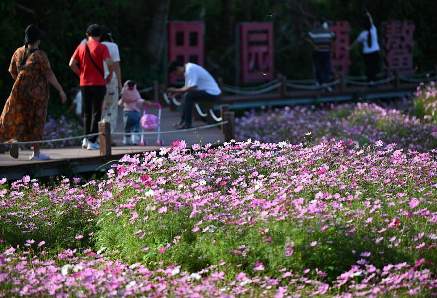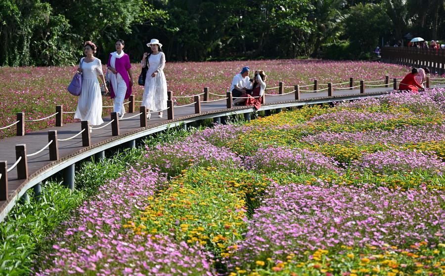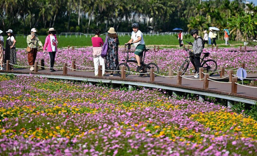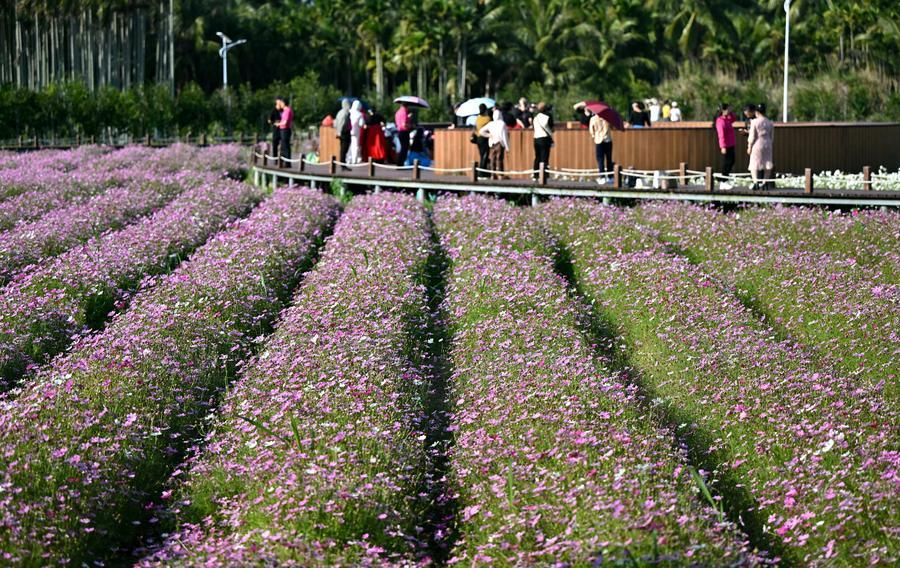 17日、海南省瓊海市ボアオ鎮の南強村で花を楽しむ観光客。(ボアオ=新華社記者/郭程)
