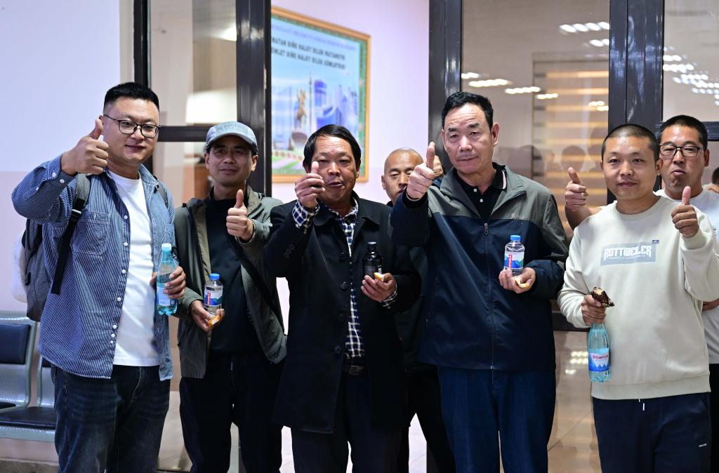 17日、イランから退避し、トルクメニスタン・セラフスの出入国検査所で撮影に応じる中国人ら。(セラフス=新華社記者/李任滋)