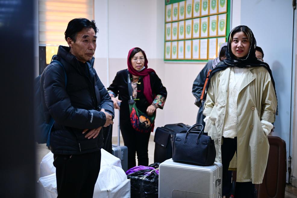 17日、イランから退避し、トルクメニスタン・セラフスの出入国検査所を出る中国人ら。(セラフス=新華社記者/李任滋)
