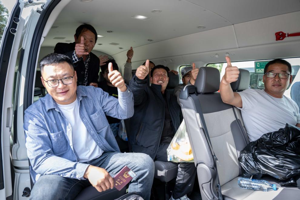 17日、トルクメニスタン・セラフスの出入国検査所から首都アシガバートへ向かうため、車に乗り込んだ中国人ら。(セラフス=新華社記者/李任滋)