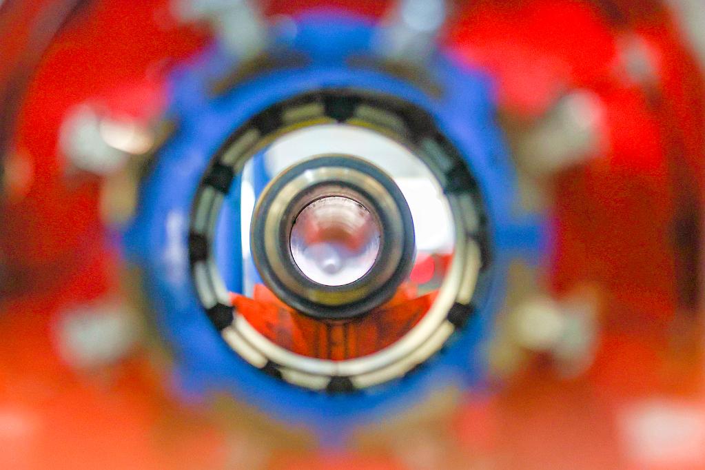 17日、中海油田服務のドリルパイプ自動点検・保守工場で、保守作業を行うロボットアーム。(天津=新華社配信/杜鵬輝)
