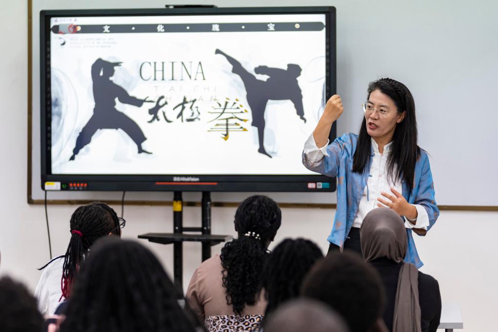 18日、ケニア・ナイロビ大学孔子学院で、地元学生に太極拳に関する講義を行う教師。(ナイロビ=新華社記者/謝剣飛)